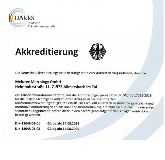 Home » News Neue Akkreditierungsurkunde 2025Entdecken Sie unser neues kostenloses Prüfmittelportal: ProCal CloudNeue Zertifizierung SQS IQNET – ISO9001-2015Information über die kommenden neuen AkkreditierungenNeue Kalibrierpreislisten sind OnlineNeuer Fachbericht über die Melutec Metrology GmbH in EU BusinessAuszeichnung mit dem „German Business Award 2020“DAkkS Kalibrierung von Parallelendmaßen mit kleinsten MessunsicherheitenNeuer Partner in NRWFrohes neue JahrNeue Akkreditierungsurkunde – Umstellung DIN EN ISO IEC 17025:2018 – ErweiterungsakkreditierungErweiterung GewindescannerErweiterung KoordinatenmeßtechnikErweiterung Akkreditierung TemperaturErweiterung Akkreditierung DrehmomentErweiterung Akkreditierung GewindeErweiterung LasergraviermaschineErweiterungsakkreditierung abgeschlossenLaborerweiterung FormmessmaschineEA begrüßt geänderte Rückführungspolitik der DAkkSLaborerweiterung Planspiegel